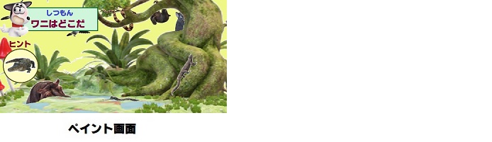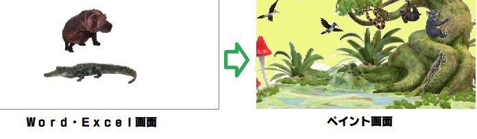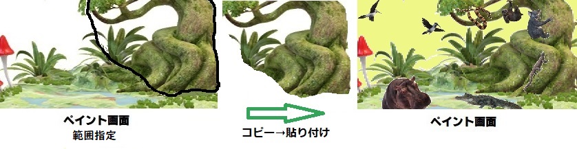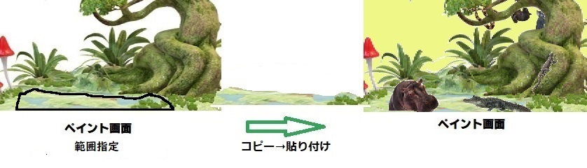 更に、コピーしておいたの画面を「選択」(Windows10)、「選択した部分」(Windows11)→「自由選択」して、の画面に「コピー」➝「貼り付け」して、絵本のカバやワニを木の陰に隠します。
