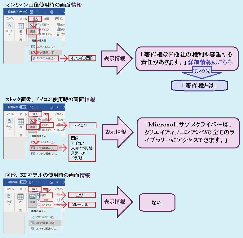 以上、今回は、Microsoft社のWeb情報に限定して話をしましたが、Microsoft社以外のWebページでは、更に、色々な情報が拡散していて、挿入画像の使用には、更なる不安や戸惑いを抱きます。