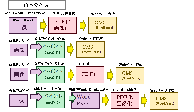 情報3が示すように、「PDF化」「画像化」に制限がなければ、絵本作りの可能性が広がり、PC初心者でも、色々な方法で、楽しい絵本を作ることができます。