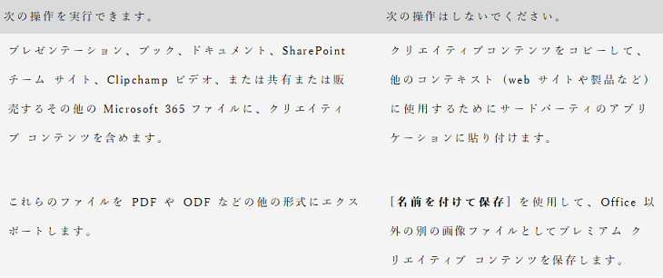 | Copilot.Microsoft 《タイトル名》マイクロソフトのストック画像の使用制限まとめ 《記載内容(抜粋)》 1 許可されている利用例 Word文書をPDFに変換して配布 2 以下は禁止されています。 ・ ストック画像をコピーしてOffice製品外で利用すること ・ ストック画像をjpgなどの画像ファイルとして保存して利用すること ・ ストック画像を単体の画像素材として再配布すること つまり、画像そのものを素材として外部で使うのはNGです。 《同じような記載内容》 Copilot.Microsoft 《タイトル名》マイクロソフトのストック画像の使用方法 |